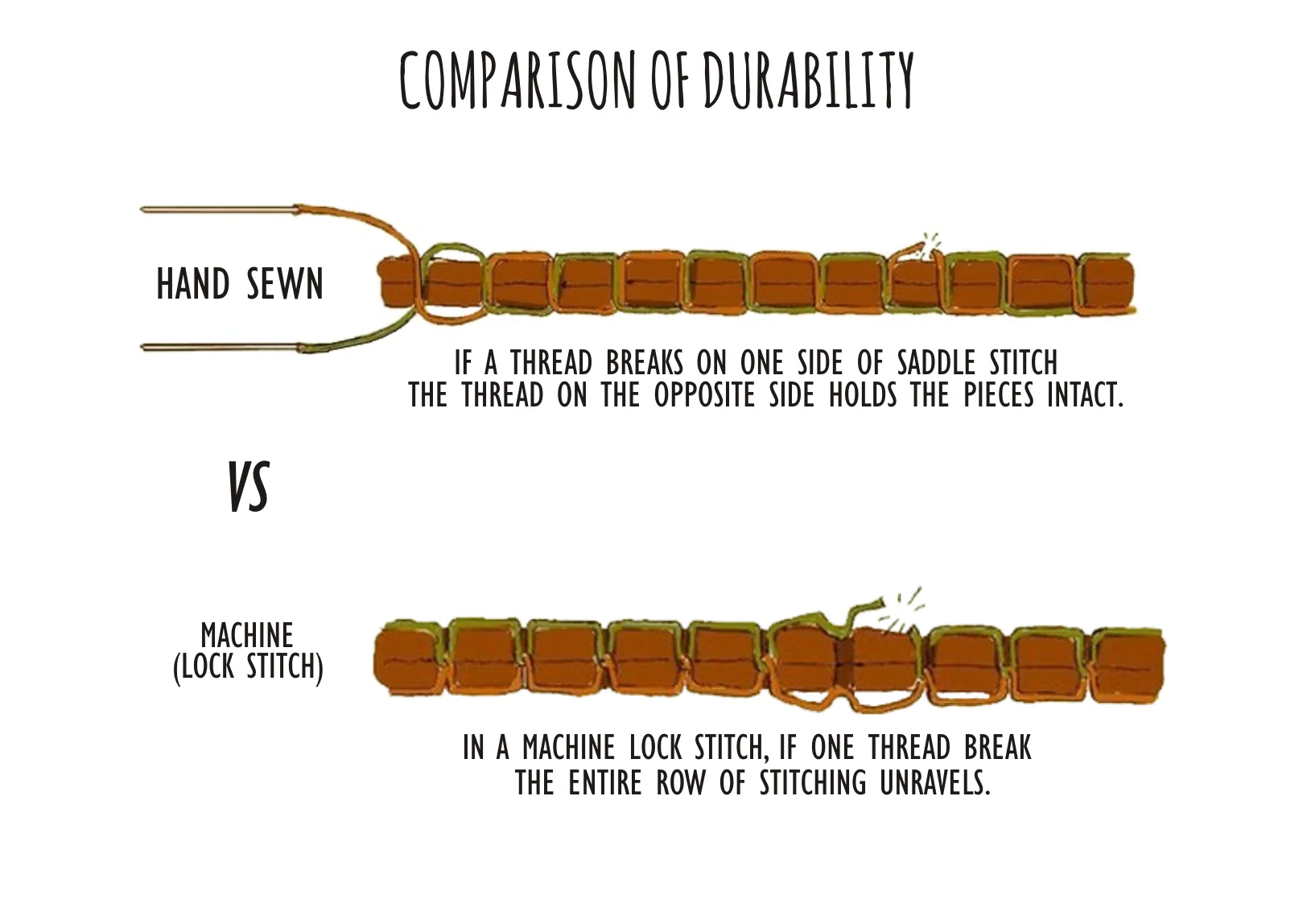 Don't get us wrong, there is nothing wrong with machine stitching. It is a widely known method to stitch small leather goods to large leather goods. It provides for a clean consistent aesthetic. However, we choose to hand stitch all our products. Saddle stitching provides a stronger, more durable stitch. Even if one side of the stitch breaks, the stitching remains intact vs. machine stitching will completely unravel. We choose the stronger and slower traditional method to ensure that all our products last beyond a lifetime.